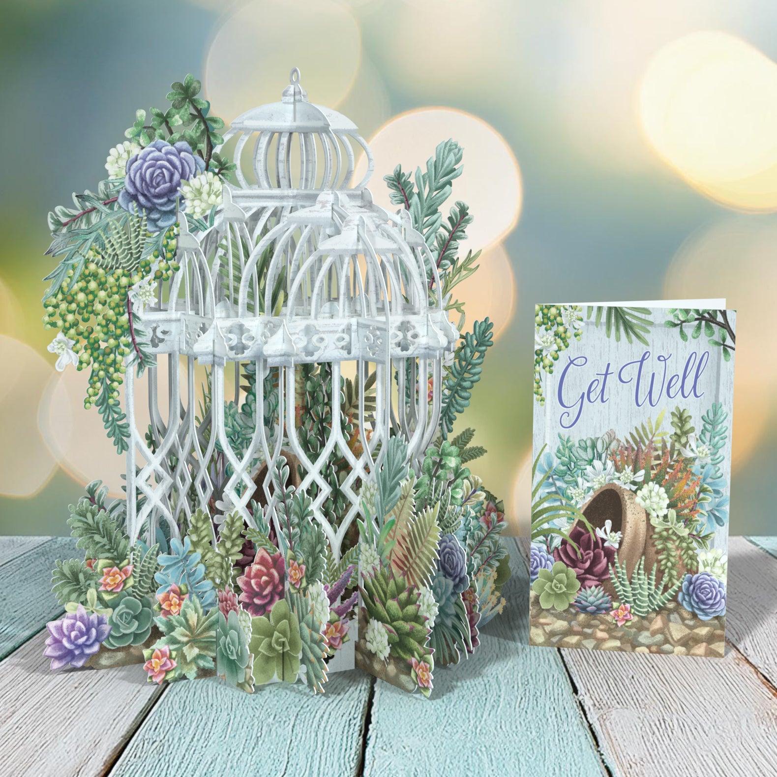 Each card unfolds to reveal a delightful 3D scene: lush succulents flourishing within exquisitely detailed birdcages. These vibrant succulents, long revered as symbols of love, prosperity, resilience, and enduring beauty, add a touch of meaningful symbolism to every occasion.
