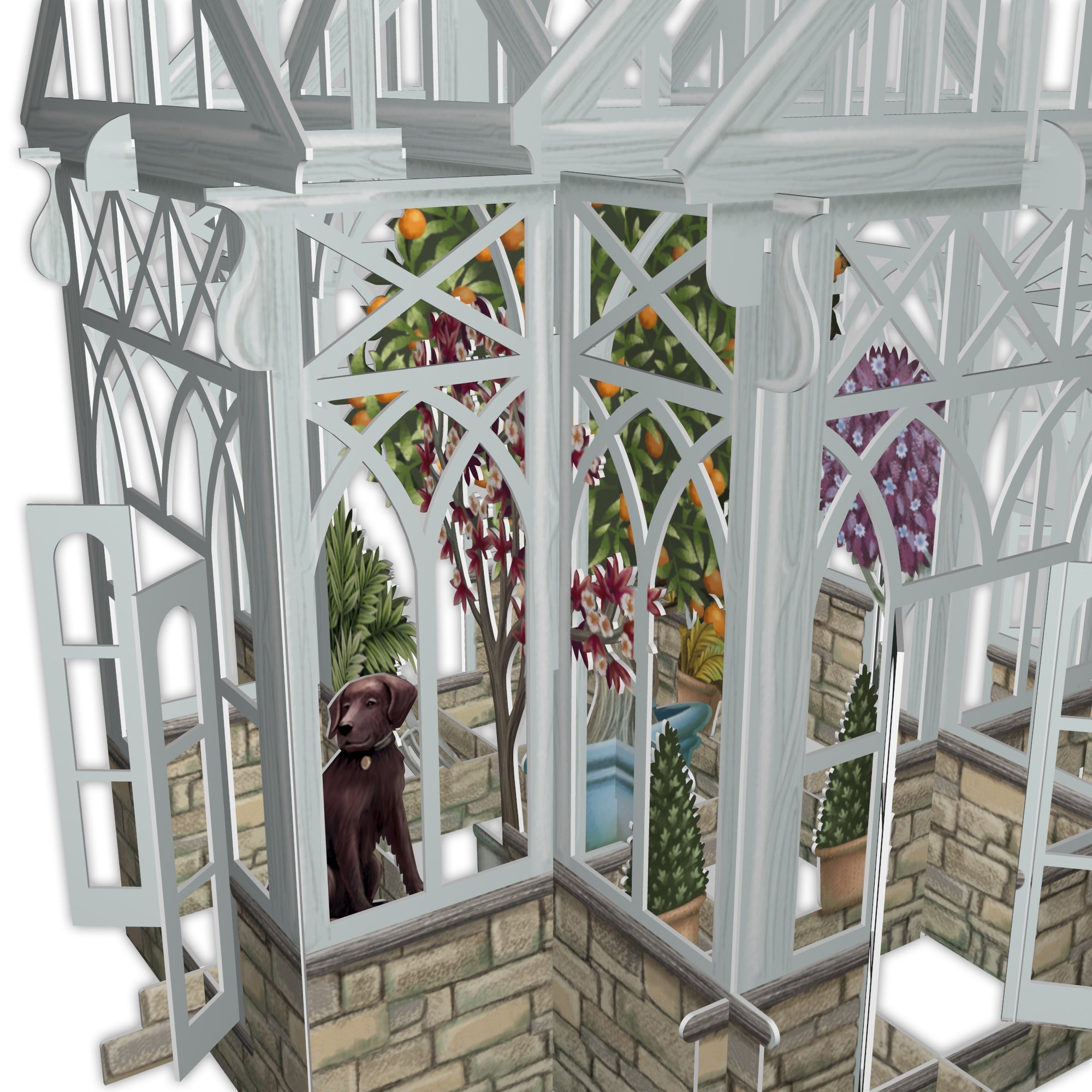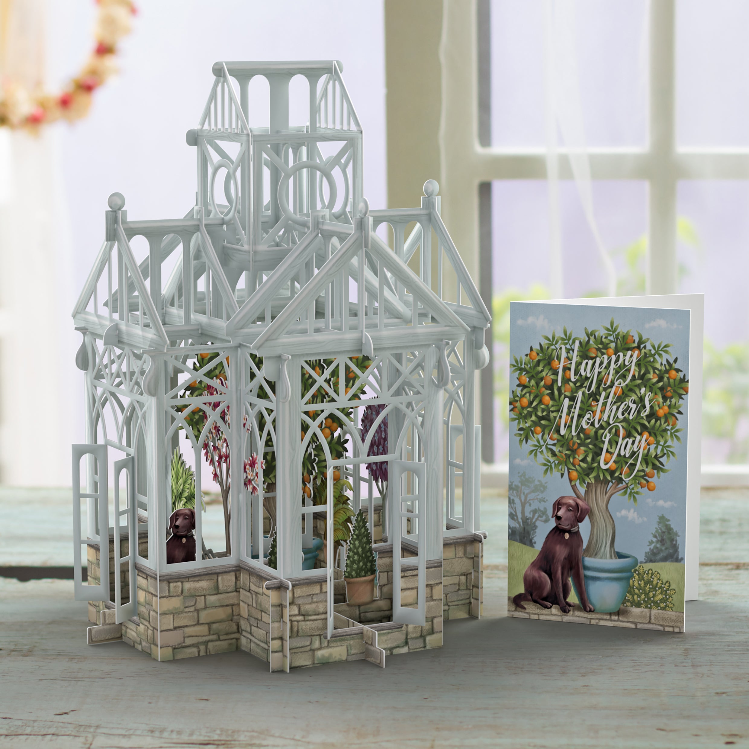 Designed with all the splendour of a Victorian Glass Palace. Our laser cut paper version is sure to delight and amaze your much loved Mother. Lush plants burst from the interior whilst Fable the Chocolate Labrador is happily hiding inside.