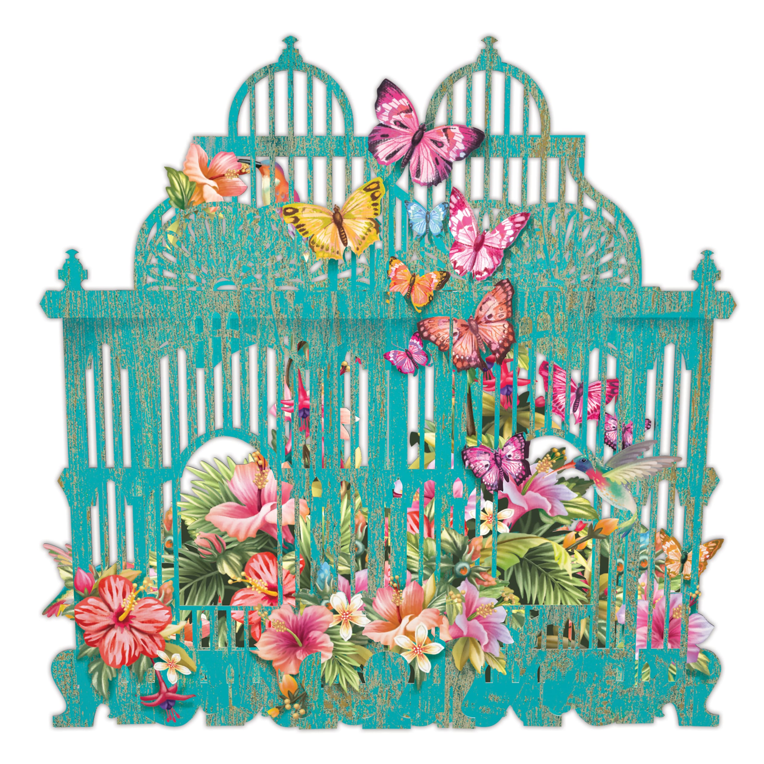 The Tropical Cage The blue cage folds completely flat to fit into the envelope and there is a large tag upon which to write your greeting.
