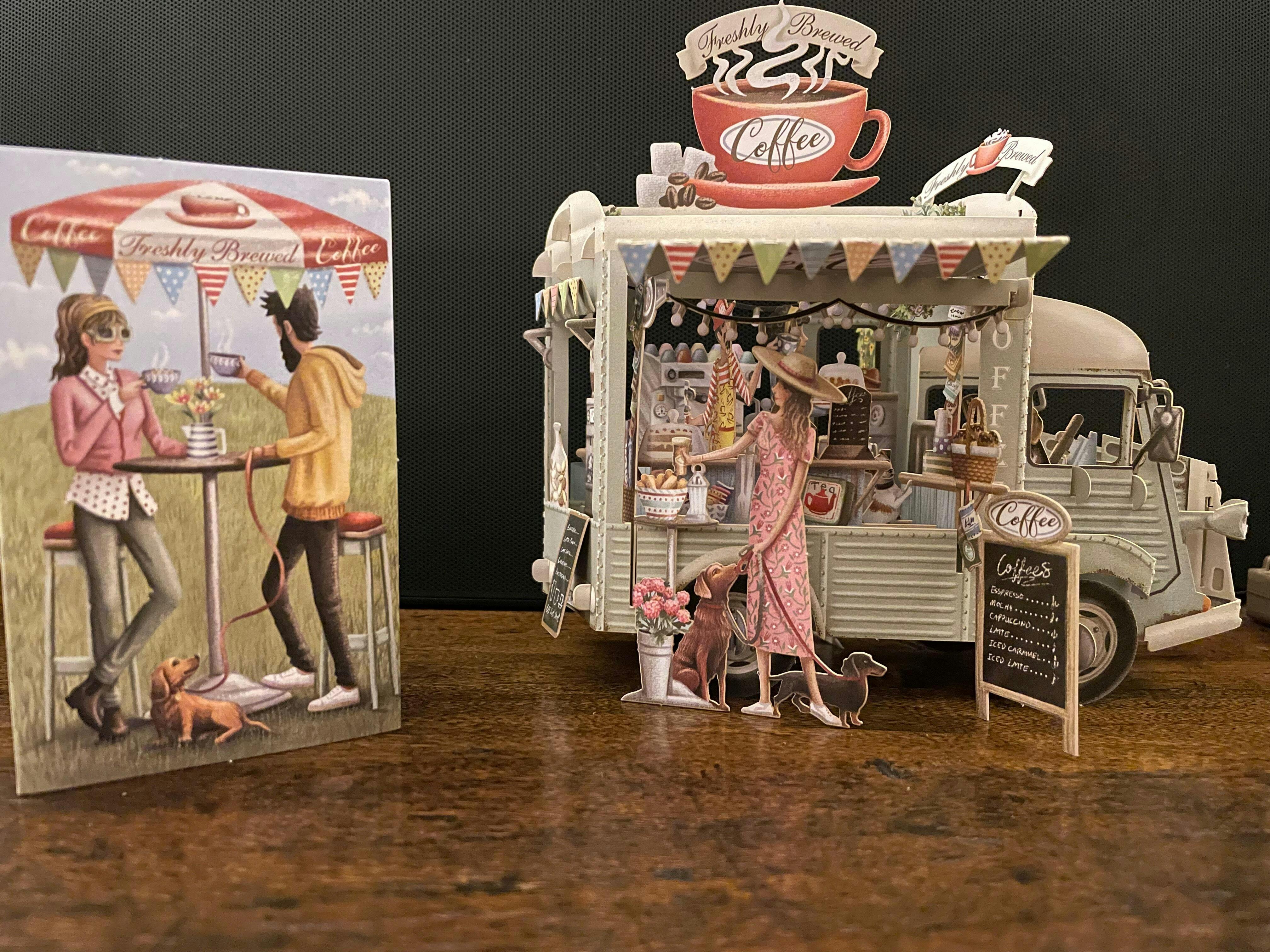 Another ingenious paper sculpture, this time a postman in his delivery van. Stuffed full of presents our jolly driver has brought everything in his van for a Birthday celebration.