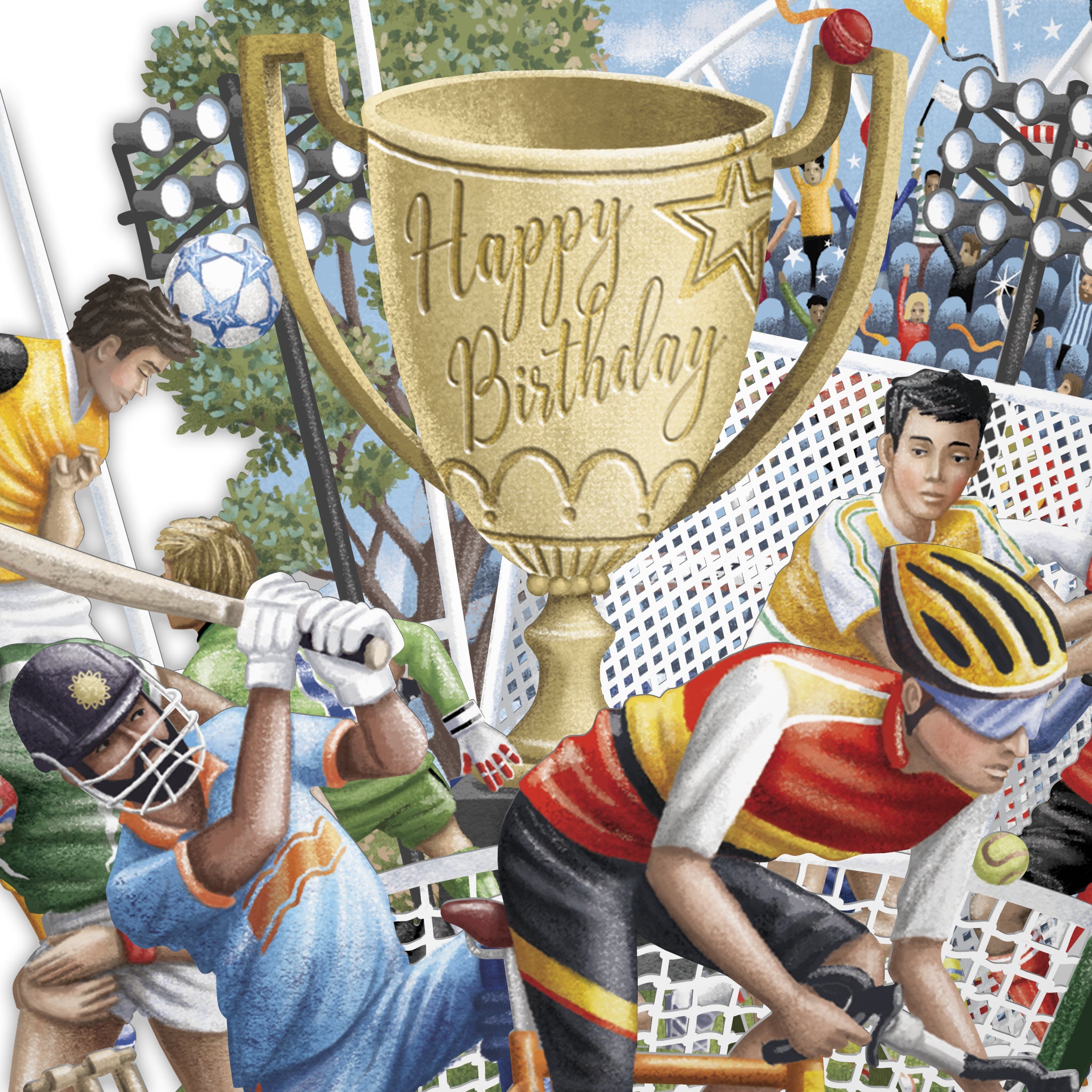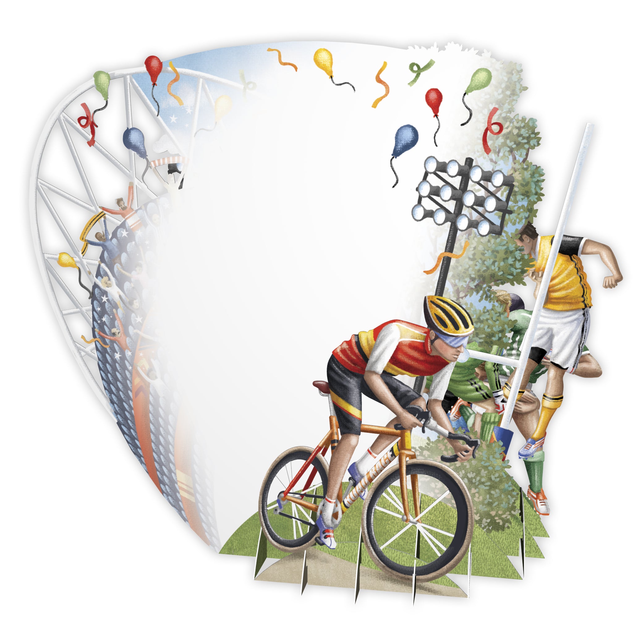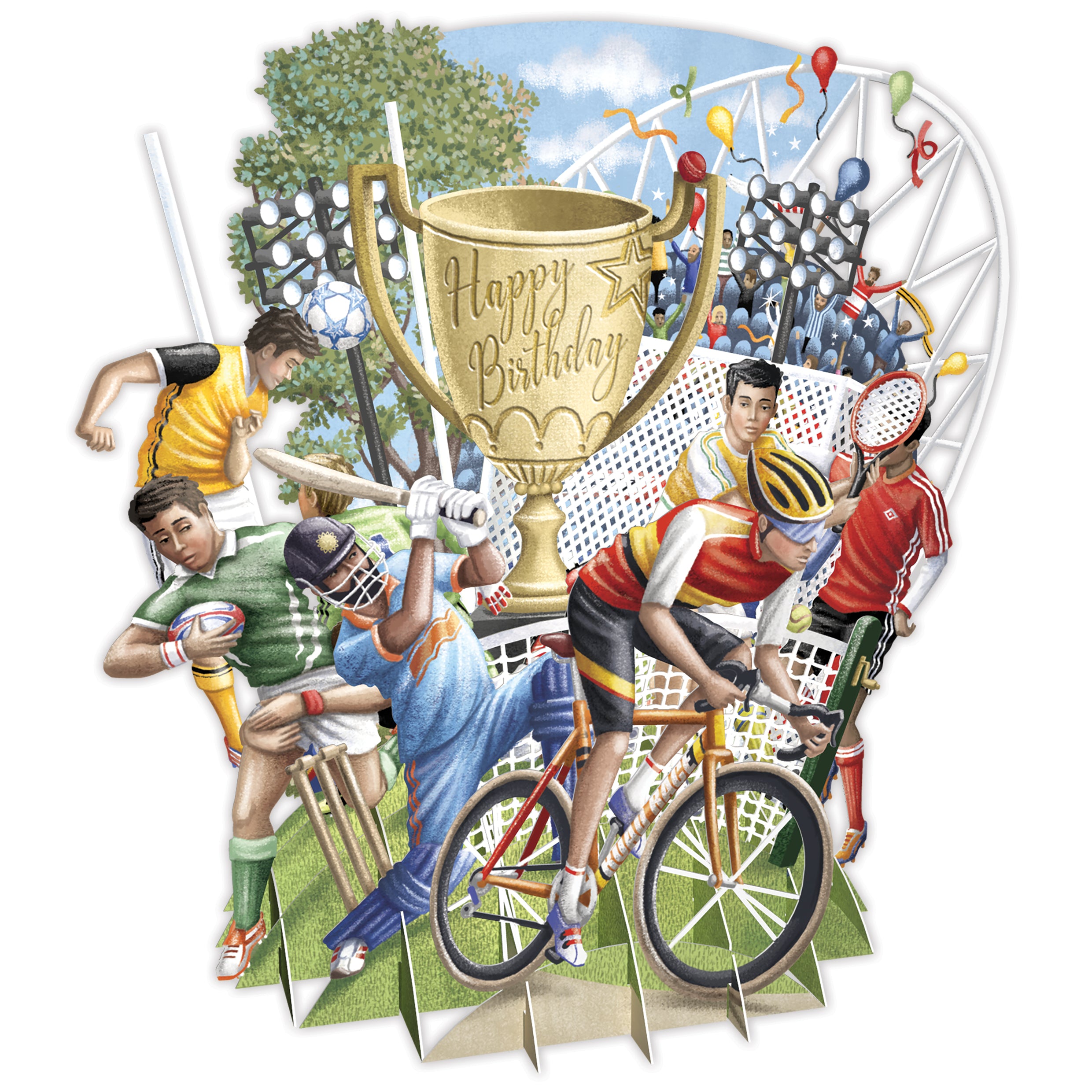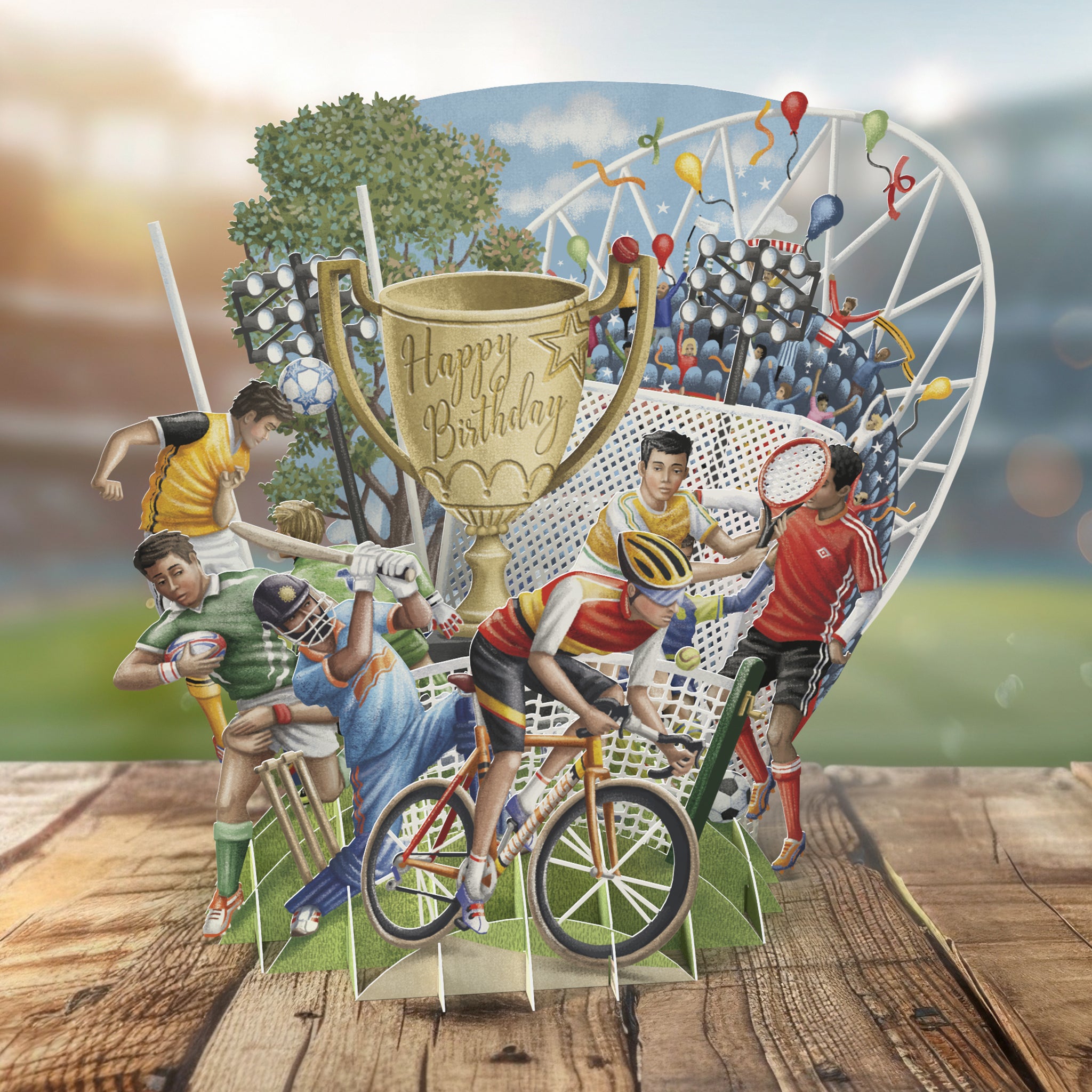 Get ready to cheer for the birthday star with this thrilling 3D pop-up card that celebrates the spirit of sportsmanship and competition. As the card opens, a dynamic scene unfolds, showcasing athletes in action across various sports - from the excitement of a football match to the precision of a cricket swing, the intensity of a rugby tackle, the speed of a cycling race, and the focus of a tennis serve.