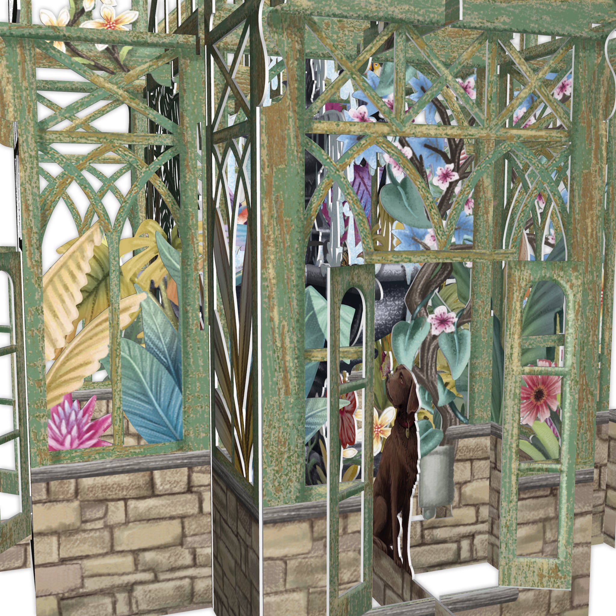 Escape to a lush, vibrant world with this spectacular 3D pop-up card! A magnificent laser-cut greenhouse springs forth, teeming with life and color. Imagine a symphony of exotic birds flitting amidst a jungle of tropical foliage. Every delicate frond, every vibrant bloom, every inquisitive feathered friend is a testament to nature's boundless creativity, meticulously captured in this paper masterpiece.